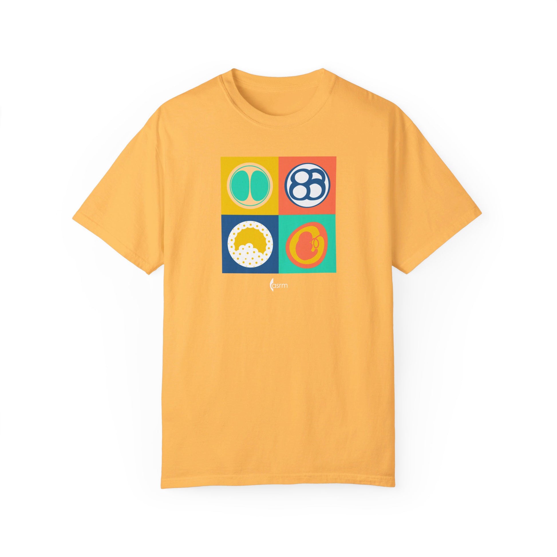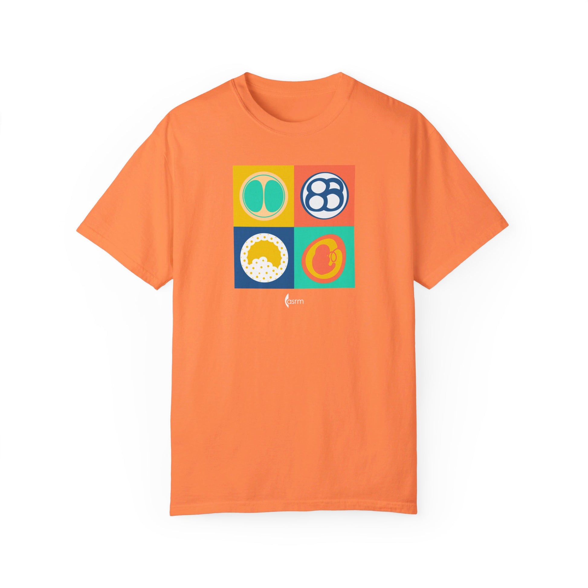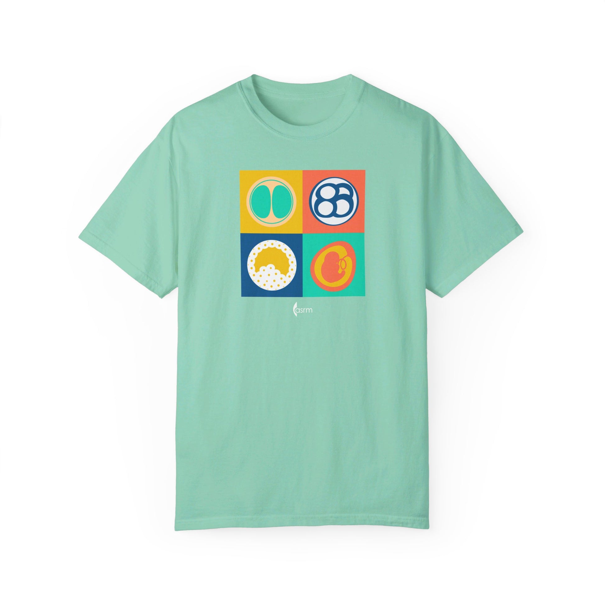 Celebrate embryology in style with this retro design featuring various stages of embryo development. Printed on a Comfort Colors t-shirt, this awesome foursome was born to adorn your wardrobe with a pop of color!